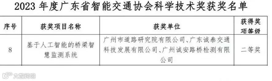 近日,广东省智能交通协会公布了2023年度广东省智能交通协会科学技术奖获奖项目。道路研究院、诚泰公司、诚安公司联合申报的《基于人工智能的桥梁智慧监测系统》荣获此奖项的二等奖。