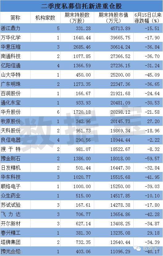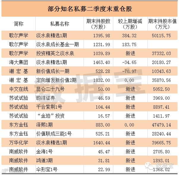 其他较为知名的私募动向方面,淡水泉二季度大幅加仓歌尔声学,新进万华化学;鸿道投资新进南威软件等。总体来看,截止到最新,私募信托二季度一共新进重仓了70多股,其中25股期末持股市值超过亿元,详细数据如下表。