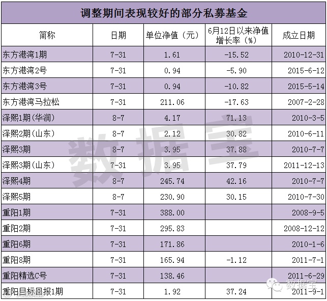 此前表现不温不火的老牌私募重阳投资在本轮调整中实现逆袭,旗下重阳1期5月29日到7月末的净值增长率高达19.79%,同期上证综指跌幅超过20.5%。另外但斌旗下以价值投资著称的东方港湾系列产品,其间净值调整幅度基本在10%左右。