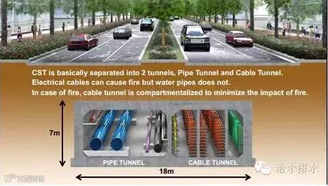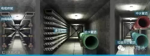特点:容纳供水管道、通信电缆、电力电缆,甚至垃圾收集系统。管廊距地面3米,全长3.9千米,工程耗资8亿新元(约合35.86亿元人民币)。