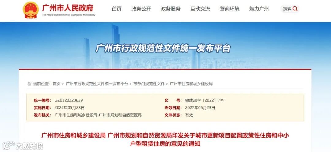 根据《国务院办公厅关于加快培育和发展住房租赁市场的若干意见》(国办发〔2016〕39号)、《国务院办公厅关于加快发展保障性租赁住房的意见》(国办发〔2021〕22号)、《中共广州市委 广州市人民政府关于深化城市更新工作推动高质量发展的实施意见》(穗字〔2020〕10号)、《广州市人民政府办公厅关于进一步加强住房保障工作的意见》(穗府办〔2021〕6号)等规定,并经广州市人民政府同意,2022年5月23日,广州市住房和城乡建设局、广州市规划和自然资源局联合印发《关于城市更新项目配置政策性住房和中小户型租赁住房的意见》(穗建规字〔2022〕7号)。