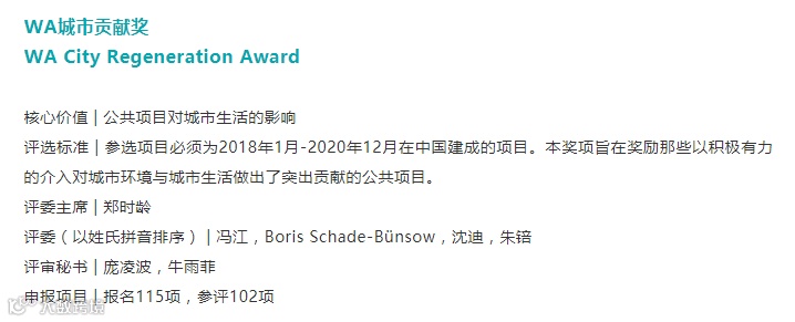 “WA城市贡献奖”以公共项目对城市生活的影响为核心价值,旨在表彰以积极有力的介入对城市环境和城市生活做出了突出贡献的公共项目。