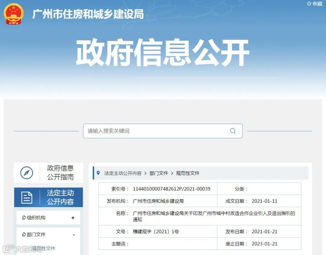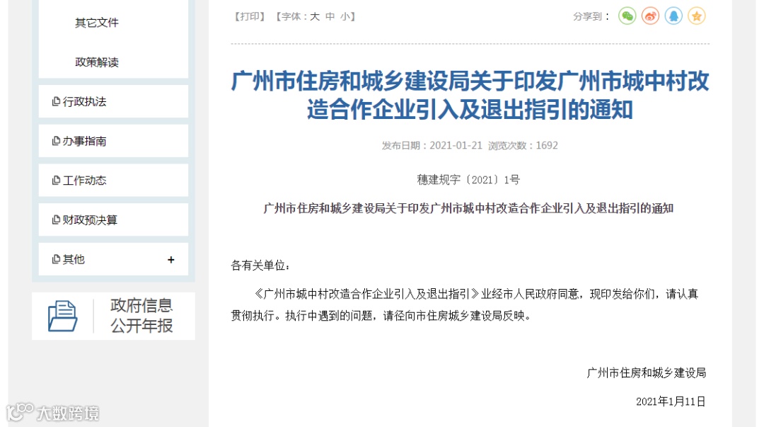 为充分发挥市场在资源配置中的决定性作用,通过合作企业引入优质的产业、教育和医疗等资源,增强城市产业核心竞争力和综合服务能力,推动广州高品质、高质量发展,促进老城市焕发新活力,2021年1月21日,广州市住房和城乡建设局正式发布《广州市城中村改造合作企业引入及退出指引》(穗建规字〔2021〕1号)。
