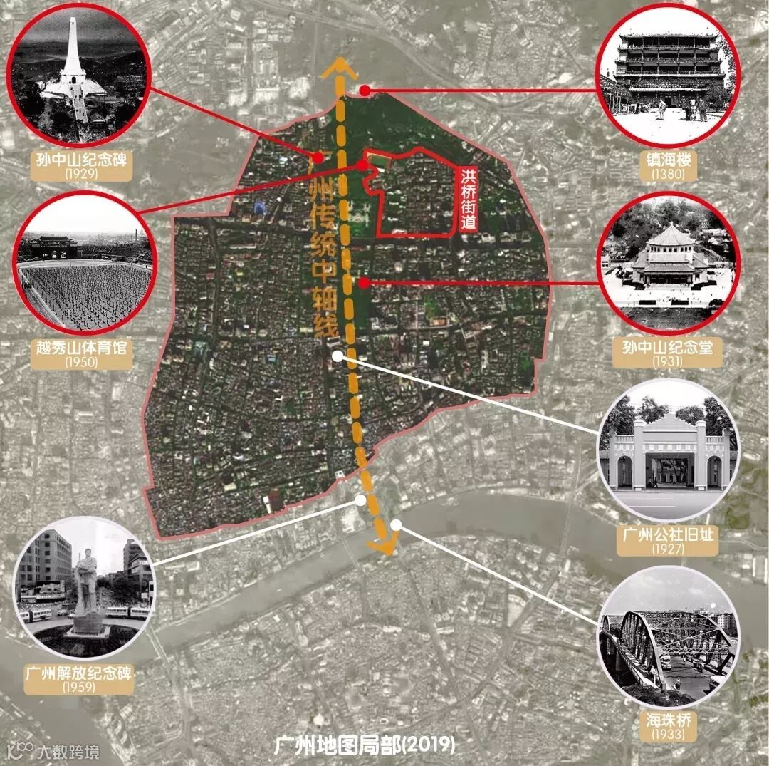 广州的传统中轴线北起越秀山,镇海楼、孙中山纪念碑、孙中山纪念堂、广州公社旧址、广州解放纪念碑、海珠桥等多个优秀历史建筑为景观标志,珍珠般串联起广州的文化传承。