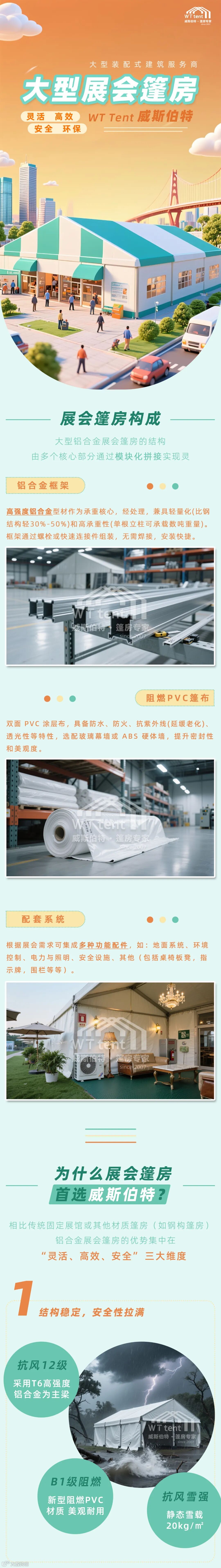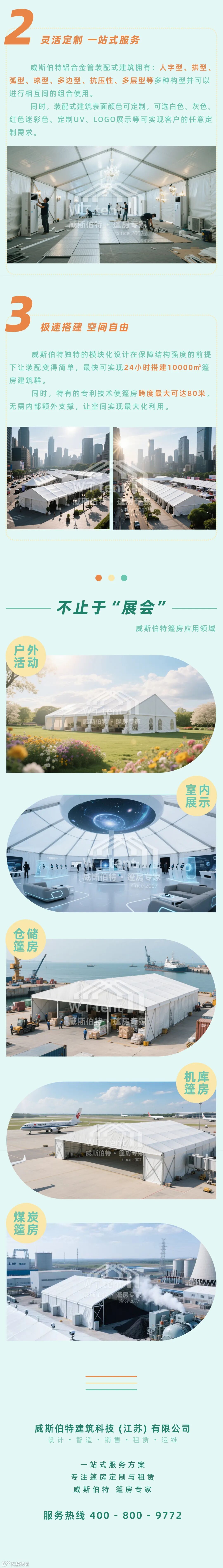 产品主要有:尖顶、人字顶、球形、弧形、拱形、桃型及各类异形篷房。我们的活动篷房、仓储篷房、婚庆篷房、展会篷房被广泛应用于家庭聚会、商务会议、展会展览、大型庆典、仓储物流、救灾检查等场景中。篷房中间无任何支柱,场地100%使用。