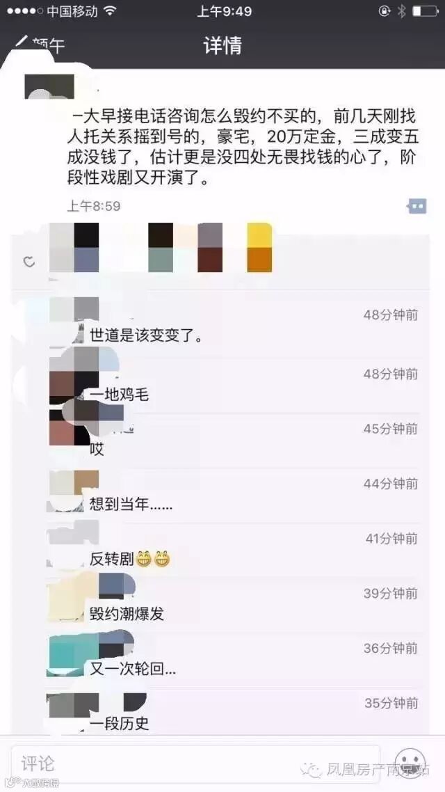 有开发商在朋友圈感慨,阶段性戏剧又上演了。以前是各种打电话咨询怎么才能买到房,现在都在咨询怎么毁约不买房。