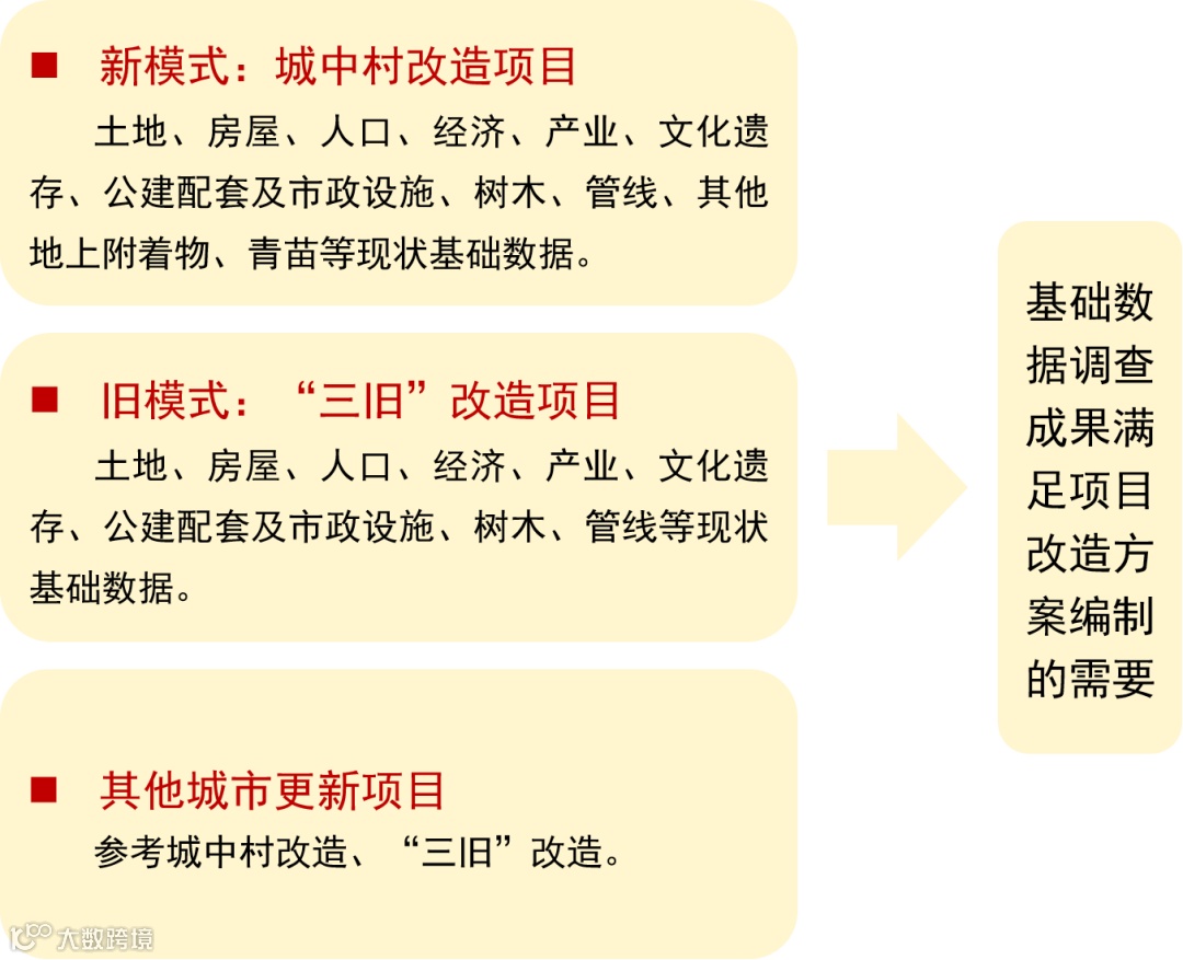 《管理办法》规定了城中村改造(新模式)、“三旧”改造(旧模式)以及其他城市更新活动项目的基础数据调查工作内容。
