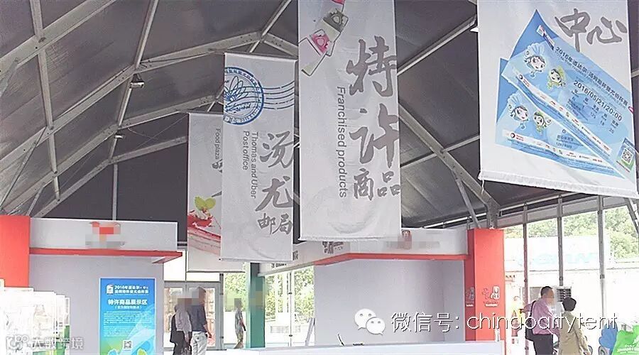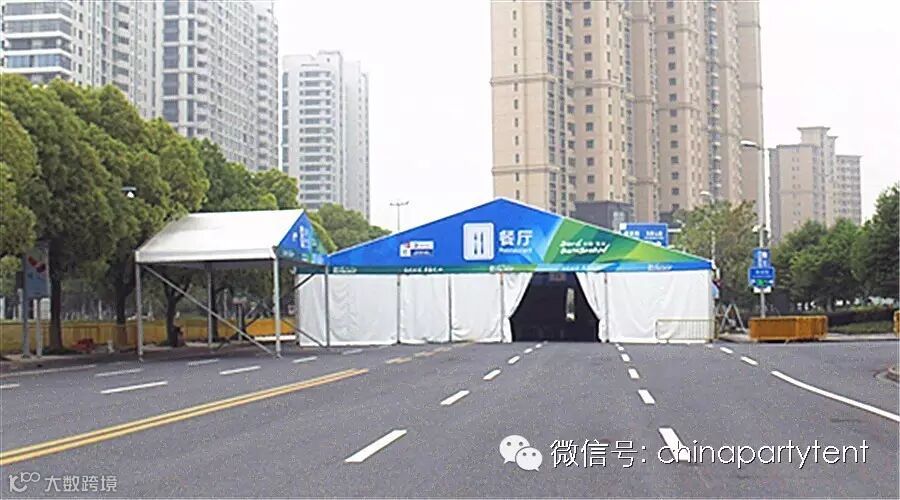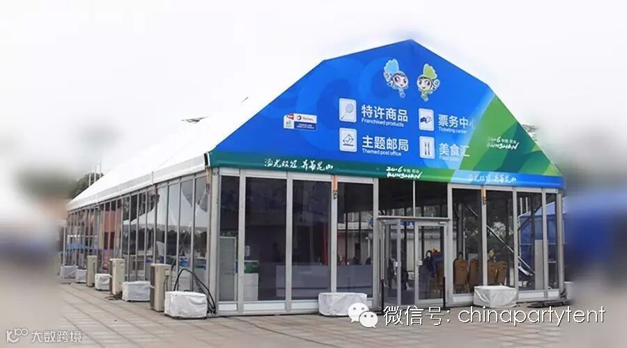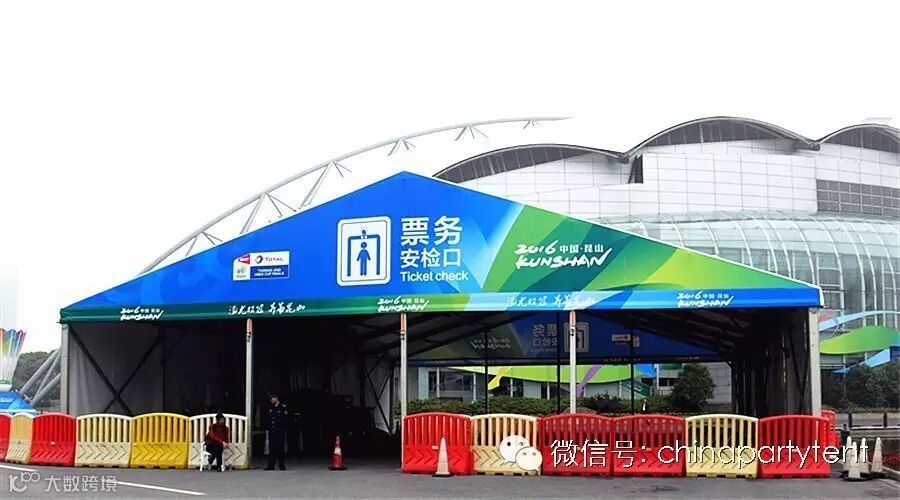 本次赛事,特许商品售卖处拱形篷房是这次篷房规格中的一大亮点,配合四周玻璃墙和双开玻璃门,地板系统,使此次国际赛事规模更加强大。拱形篷房的另一大亮点是承重比普通的人字形篷房斜梁承重更大,适合国际运动赛事,国际时装秀场,高档晚宴等大型活动。