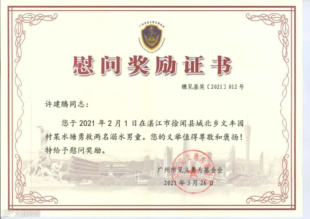 市见义勇为基金会向广州市近期涌现的6名见义勇为人员颁发了见义勇为证书和慰问奖励金。广州市道路工程研究所所属广州诚安路桥检测有限公司(简称“研究所诚安公司”)80后党员许建腾接受表彰。