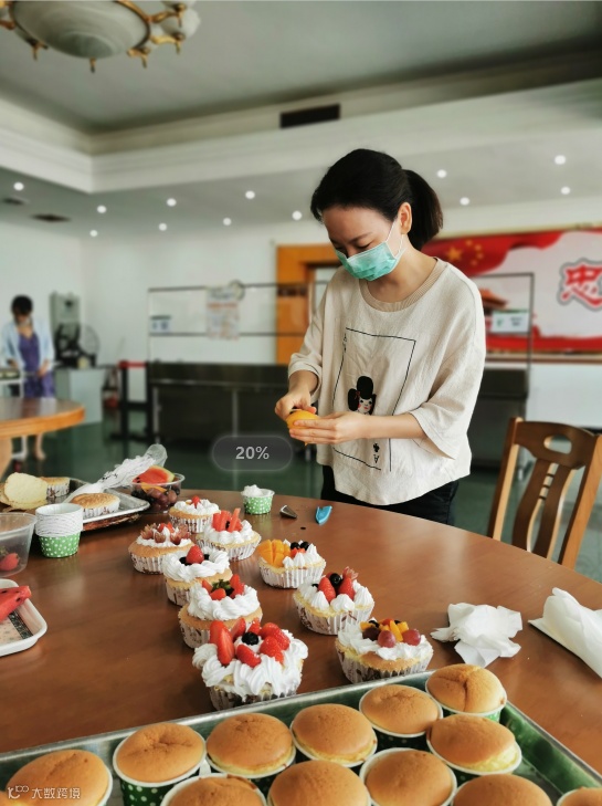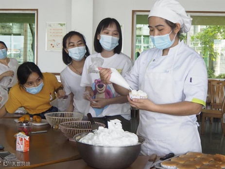 活动现场,纸杯、餐盘、鸡蛋、白糖、食用油、水果块等器具和食材一应俱全。活动特邀食堂糕点师亲自指导。活动开始后,五个小组成员在糕点师的讲授下,认真学习蛋糕制作的工序。