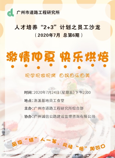 7月24日,广州市道路工程研究所举办“人才培养2+3计划”之“员工沙龙”(第六期)。本次沙龙的主题是“激情仲夏 快乐烘焙”。