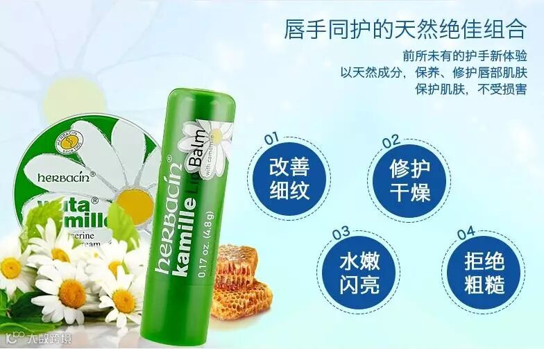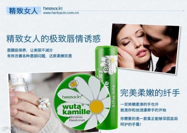 肌肤是上天恩赐给女人的天然屏障,值得你用心呵护。每个女人都希望有粉嫩的嘴唇,如瓷的肌肤,婀娜的身姿。德国小甘菊(herbacin),给最敏感最脆弱的肌肤最温柔最滋润的保护。天然的芦荟成份确实可舒缓及镇静敏感的肌肤。产品可深入渗透肌肤,保湿不油腻,还有清新淡雅的甘菊香哦。