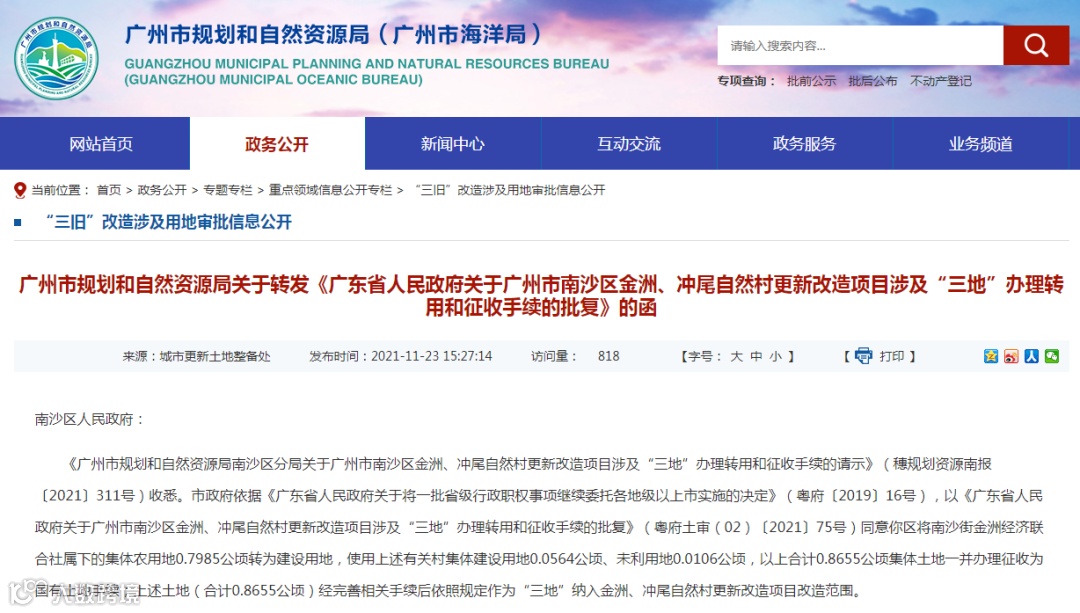 注:可点击下方“阅读原文”查看《广东省人民政府关于广州市南沙区金洲、冲尾自然村更新改造项目涉及“三地”办理转用和征收手续的批复》(粤府土审(02)〔2021〕75号)详情。