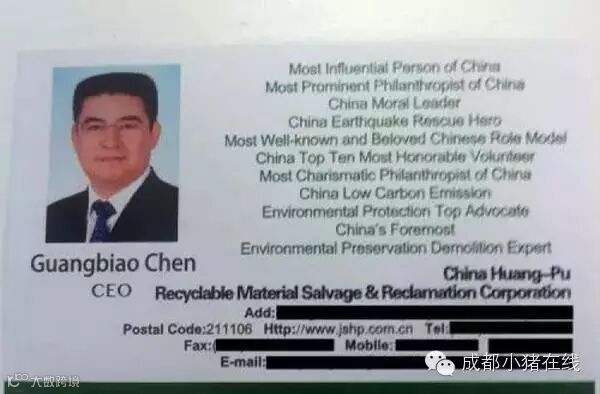 后来,他去了趟美国,新印的英文名片立马洋气了不少,但各种头衔也是一样不落,“全中国最有影响力的人”、“中国道德楷模”、“中国最著名慈善家”…都被翻译成了英文。