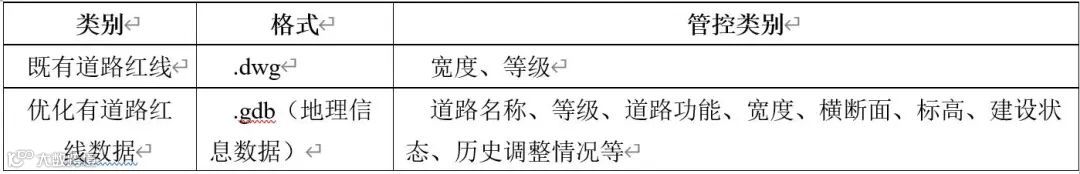 目前道路红线总网为DWG格式。图层分类中,划分为道路边线、道路中线、立交桥梁、道路标注4个大类。其中道路中线按高快主次支等级细分为5个图层,道路边线分为干道、支路、非定位道路3层。道路用地以道路红线围蔽的范围为道路用地,即控规留白区域。