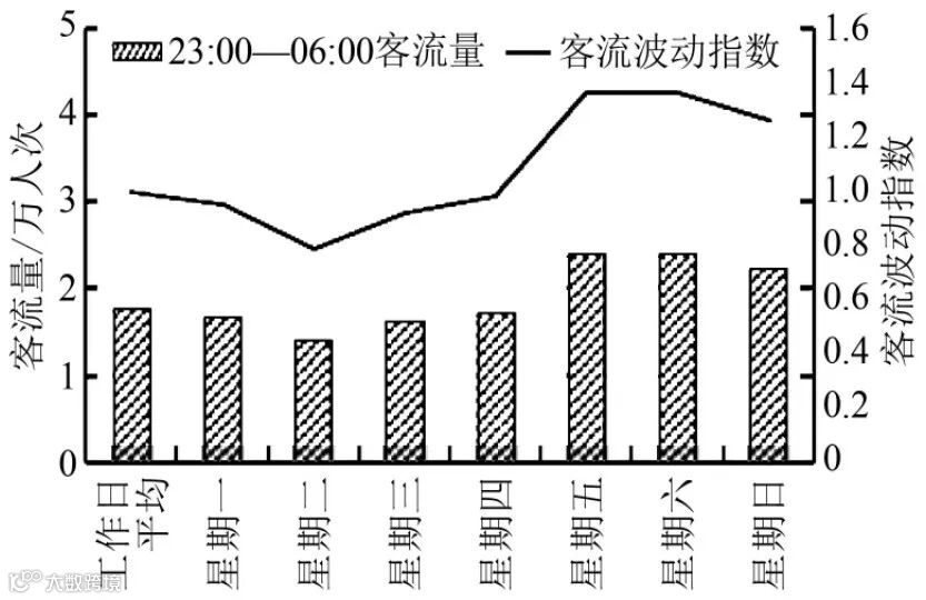 从图2中的广州市轨道交通一周客流波动特征来看,周日夜间客流与周五和周六处于同一水平,可考虑少数线路在周五-周日夜间运营的模式。