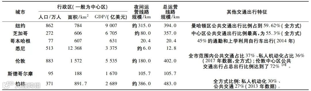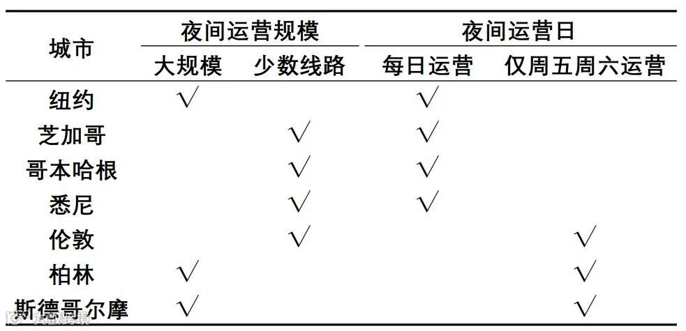 少数线路夜间运营且每日提供夜间运营服务的城市有芝加哥、哥本哈根和悉尼,这些城市中心区规模相对较小,人口密度较低。夜间运营的线路保留了连接重要交通枢纽以及客流规模大的线路。