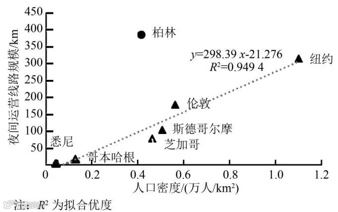 (2)夜间运营线路规模与城市人口密度成正比。除夜间经济最为发达的柏林以外,其余城市的人口密度与夜间运营线路规模呈线性关系(图1)。