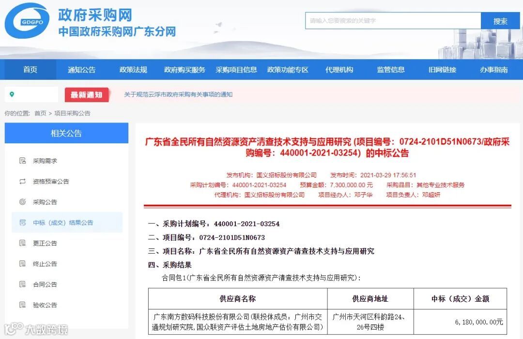 2021年广州市交通规划研究院与广东南方数码科技股份有限公司、国众联资产评估土地房地产估价有限公司组成联合体,成功中标广东省土地调查规划院“广东省全民所有自然资源资产清查技术支持与应用研究”项目。