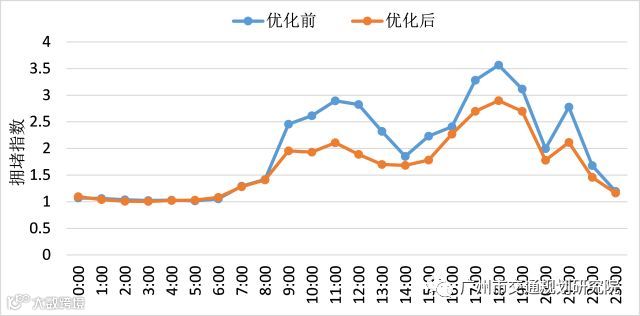 利用高德优化前两周及优化后两周工作日东进口道的路段数据进行对比分析,数据表明:优化后东进口路段9:00—13:00拥堵指数下降了26.88%,15:00—20:00拥堵指数下降了13.52%,交通改善效果明显,而南北方向的交通运行情况基本没有变化。