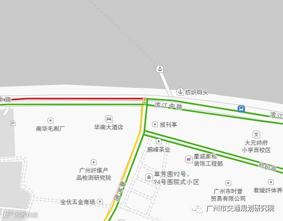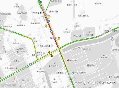 通过浮动车实时上传的速度数据,可以获得交叉口各个进口道的速度数据,通过研判可了解进口道的交通运行情况。当路口某一进口道速度低(红)、其它进口道速度较高时(绿、黄)时,可发现进口道的放行时间不足,需增加进口道的放行时间;当路口的某一出口道拥堵时,说明是上游路口该方向放行时间不足,即将影响到下游路口,需对上游路口的放行时间进行优化;当拥堵蔓延到某一方向的进出口道时,说明存在排队溢出现象,此时需对上游路口控流、下游路口进行疏导。通过对浮动车数据的计算和分析,可以获知信号控制上存在各种问题,有利于对信号控制方案进一步优化。