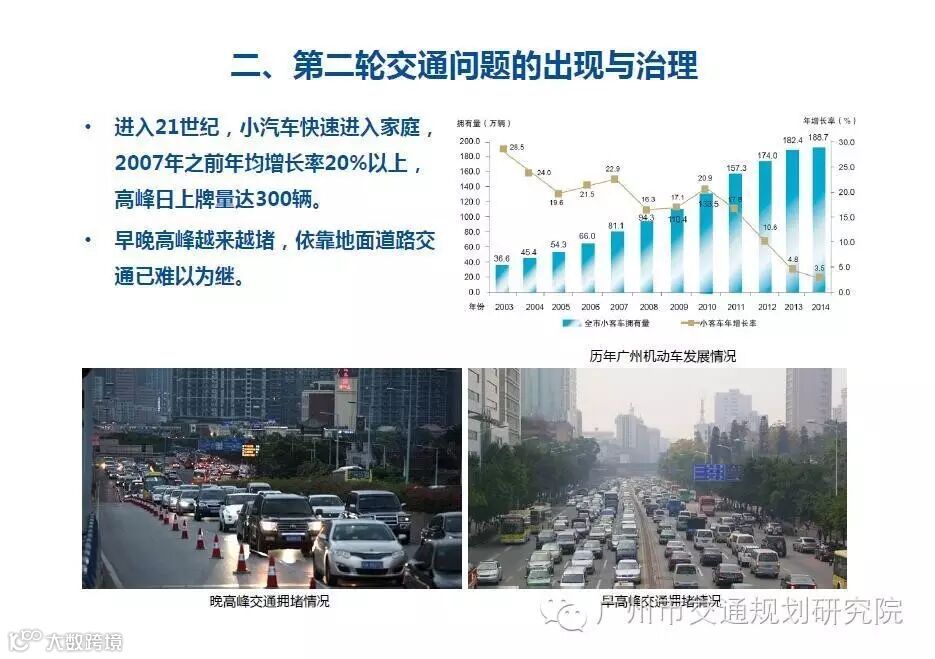 广交研城市交通拥堵问题日益严重,治堵是一项长期性系统性的工作,广州作为中国一线城市之一,超千万人口的交通出行问题是政府和社会需要共同解决的重要问题之一。治堵很难有一套既定的政策和方案,需要随着社会、经济以及技术的发展不断更新和完善。