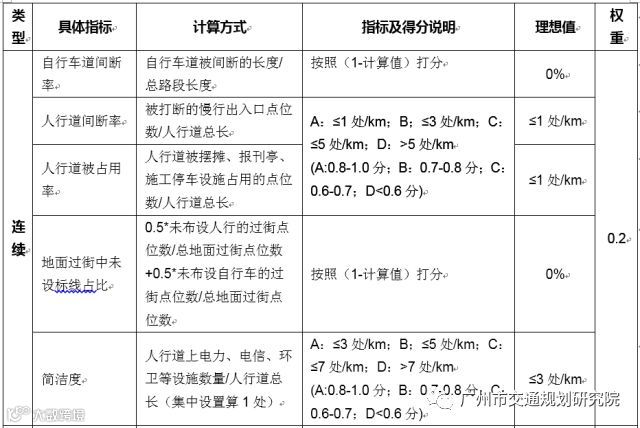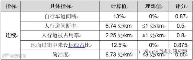 路段两侧共有6处人行道被打断点位,自行车道保持连续,连续指标评分如下表: