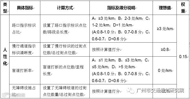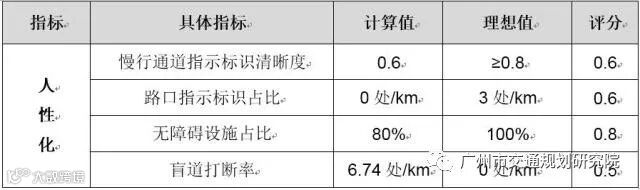 路段慢行标志标线设置清晰,无障碍设施设置较充分,但是缺乏路口指示标志,盲道打断率高,人性化指标评分如下表所示。