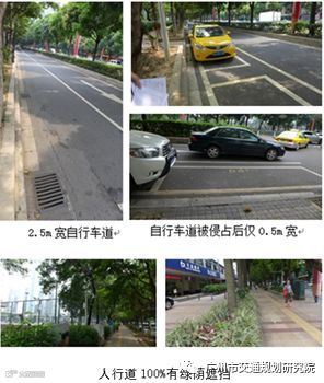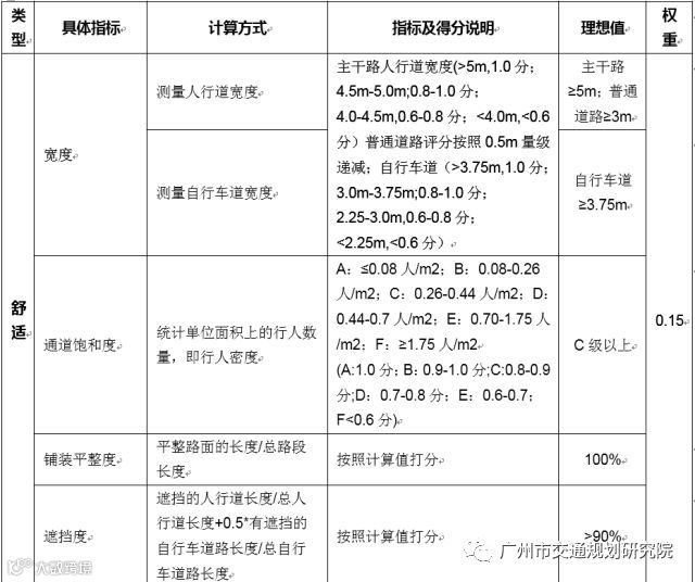体育东路部分路段自行车道被机动车停车位占用,仅剩余0.5m左右供骑行,未设置机动车停车位的非机动车道宽度为2.5m,人行道100%有绿荫遮挡,舒适指标评分如下表。