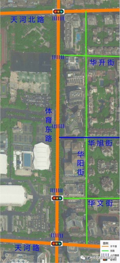 选择天河区体育东路进行慢行设施评价举例分析,体育东路是一条南北走向的道路,全长1.6km,本次设施调查选取的是天河路至天河北路段共900m,主要路口有天河路、华文街、华旭街、华升街、天河北路。