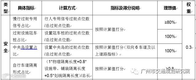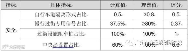 路段自行车道100%采用了机非划线隔离形式,过街安全岛设施比较完善,过街设施租车桩设置率100%,安全指标评分如下表: