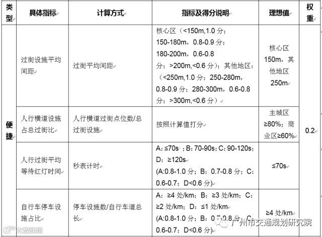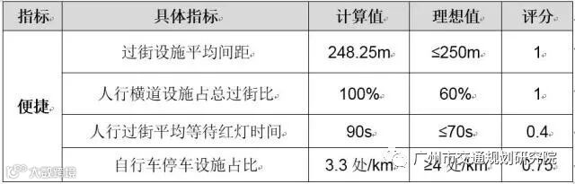 路段两侧共有5处人行过街设施,均为平面过街形式,设施间距近250m,3处有信号灯控,平均等待时间为90s,3处自行车停车设施,便捷指标评分如下表: