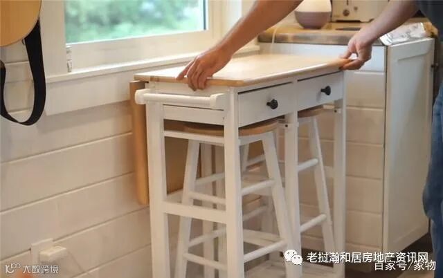 在还未走入厨房的位置,有一张小餐桌,这张小餐桌采用了折叠式设计,连椅子也收纳在了桌面下,平时就放在橱柜边扩充台面空间,而当饭做好以后,就可以展开变出一个小餐厅~