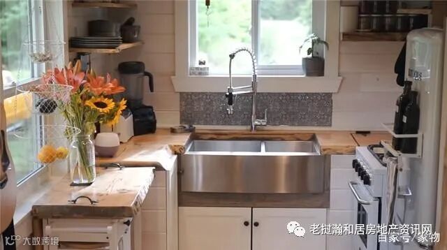 在U形厨房的区域,可以看到空间虽然不大,但是各种厨电一应俱全,从双槽的水槽、面包机,到烤箱集成一体灶,再到一个双门的冰箱,能满足大多数的日常烹饪需求,可谓麻雀虽小五脏俱全!