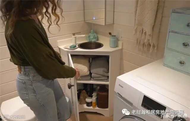 和“钻石柜”原理相同,小柜子利用切面做了柜门,在里面分层进行收纳,上层收纳替换的浴巾、毛巾,下层收纳各类洗护用品~