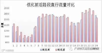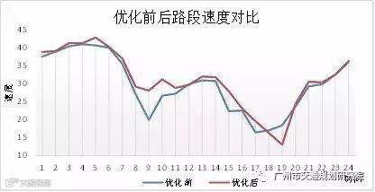 某城市干道2016年12月9日实施优化,取优化前一周及优化后一周工作日的平均数据进行对比,其中路段速度基于高德地图数据、路段流量基于SCATS检测流量,全天优化前后的数据对比如下图所示。