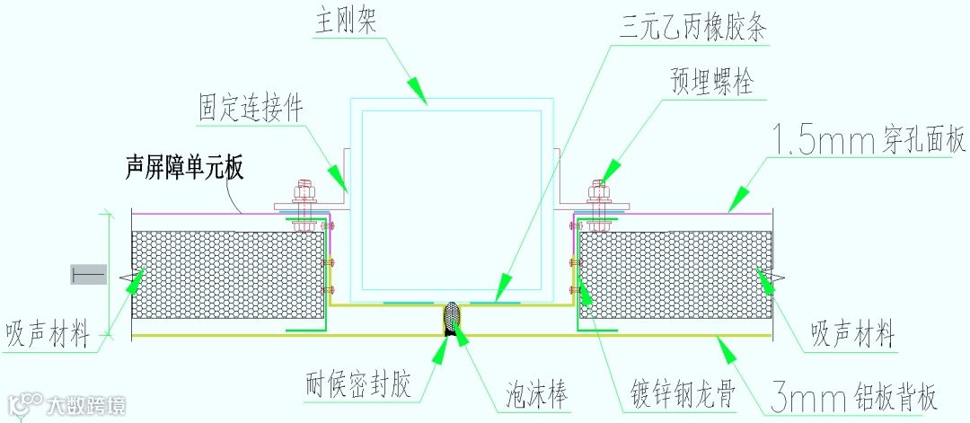 声屏障采用全新升级解决方案,创新性地提出“工厂化预制”声屏障单元板,将吸声材料、穿孔面板、装饰隔声铝背板和龙骨“四合为一”,内部吸声材料与面板形成赫姆霍兹共振吸声腔体;单元板模块形成特殊的“T”形构造,形成无缝搭接,防止噪声外溢;颠覆了传统插板式声屏障在结构内侧安装的做法;解决常规声屏障屏体搭接量不足、辅件易脱落等痛点;属国内首次创新设计。