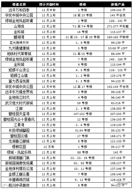 从近期预售及房企动向来看,本周推盘节奏继续加快,年底开发商开启“冲刺”模式;据不完全统计;其中汉阳中心区远洋东方境世界观和江御;白沙洲片金地保利褐石公馆和旭辉江山境、四新片绿城金地凤起听澜、古田片金地悦江时代;汉南武汉恒大时代新城和江景湾;黄陂前川中梁首府和山海观;蔡甸中建锦绣双城等楼盘加推开盘。总体来看,开发商推盘速度相对加快,尤其是纯新盘大量增加。下周武汉楼市推盘继续增加,销量将有所增长。