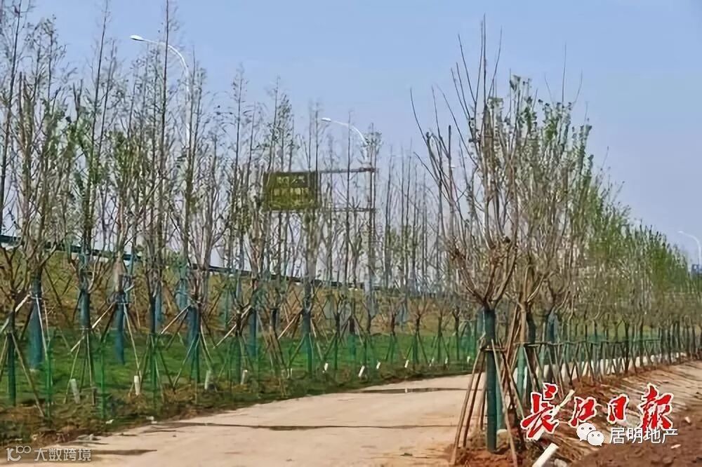 长江新城江滩公园建设工地,防汛通道两旁密植了约600棵樱花树,将形成一条樱花大道景观。