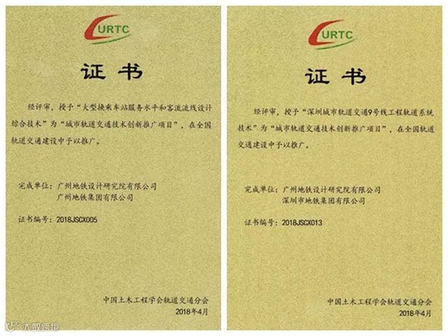 会上,中国土木工程学会轨道交通分会主持发布了经专家评审通过的“2018年城市轨道交通技术创新推广项目”(合计20项),其中我院共有4个项目获奖: “大型换乘车站服务水平和客流流线设计综合技术”(证书编号2018JSCX005)、“深圳城市轨道交通9号线工程轨道系统技术”(证书编号 2018JSCX013)2个项目为第一完成单位;“富水地区地铁车站喷涂自粘式防窜流防水系统”(证书编号2018JSCX006)、“MJS工法在砂 卵石及破碎带等复杂地层盾构近距离下穿运营地铁隧道的应用及实施”(证书编号2018JSCX012)为参与单位。