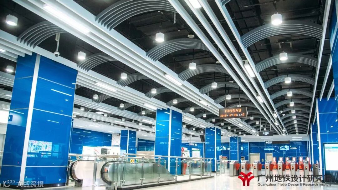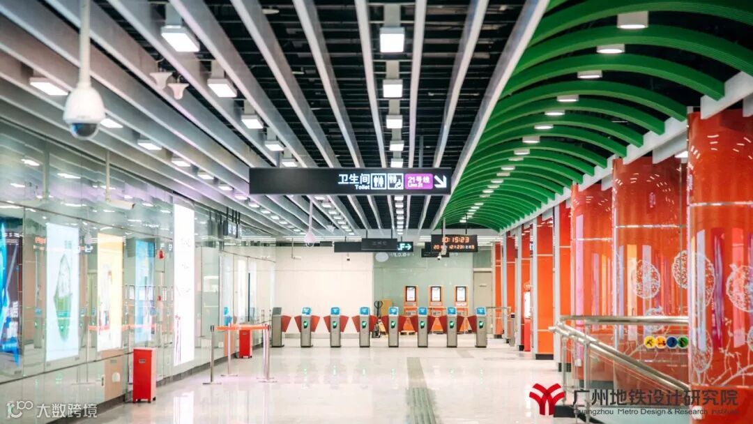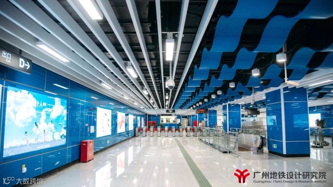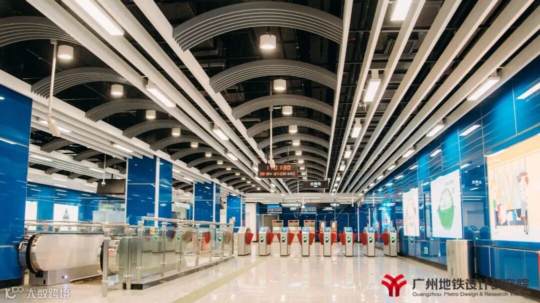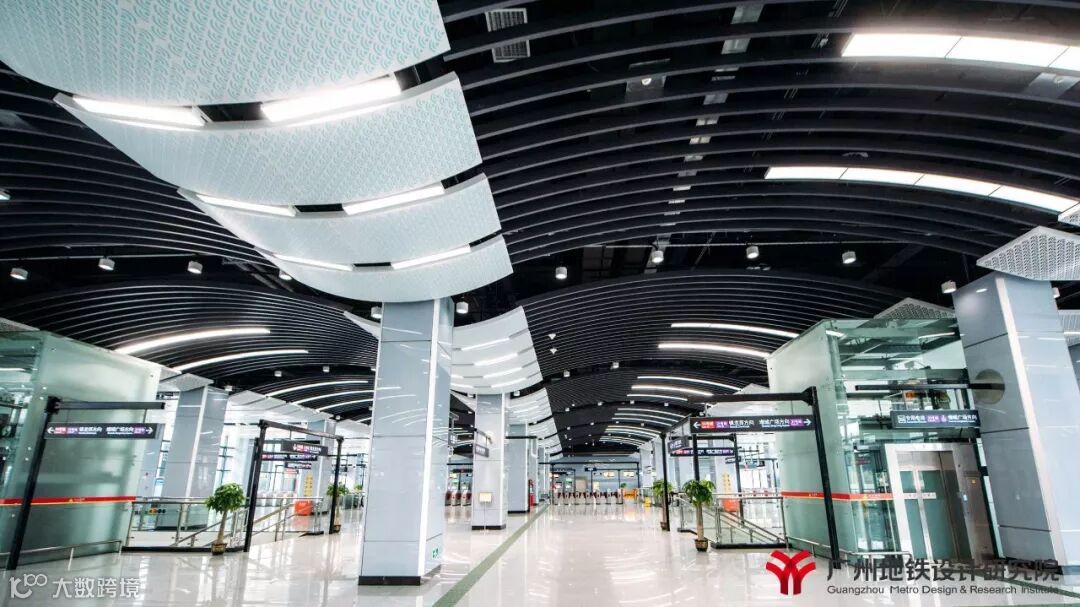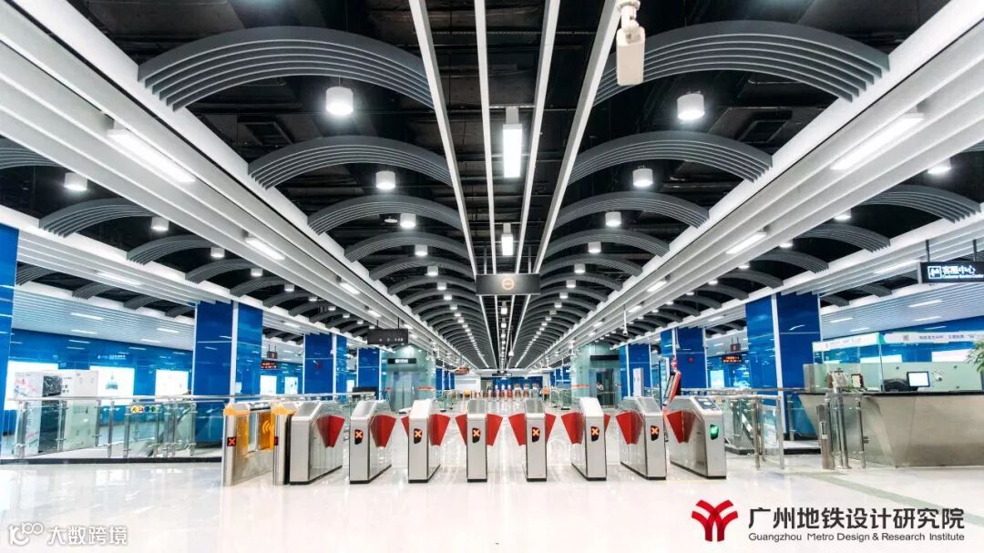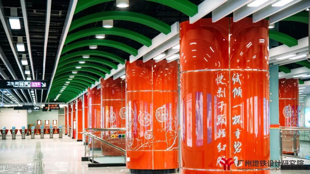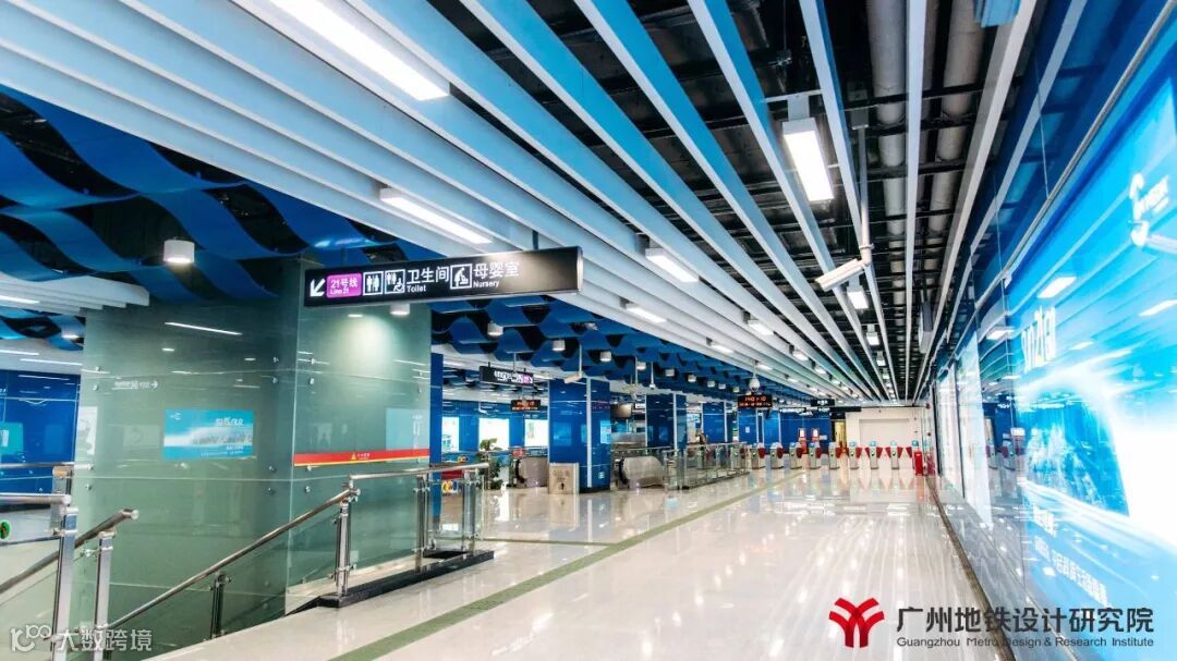 21号线“汇智新地”的装修理念,以满足车站功能为前提,以现代科技感为中心,采用“智慧蓝”为本线路的主色调,在特殊站(天河公园,镇龙,增城广场)和高架站上选用与各站相适应的不同的颜色,既提高线路颜色识别性,又能突出个性站的特点。全线车站站台层三角房外装饰板增加了各站当地特色图案,引入地域文化元素,营造舒适的空间氛围,加强人性化、接口设计。文化站增城广场烟水绿,荔枝红,雅赋贯增城,在浓厚的文化氛围中融入特色的荔枝红,点缀在青山绿水间,结合建筑形态、文化元素、装饰材料展现特色。