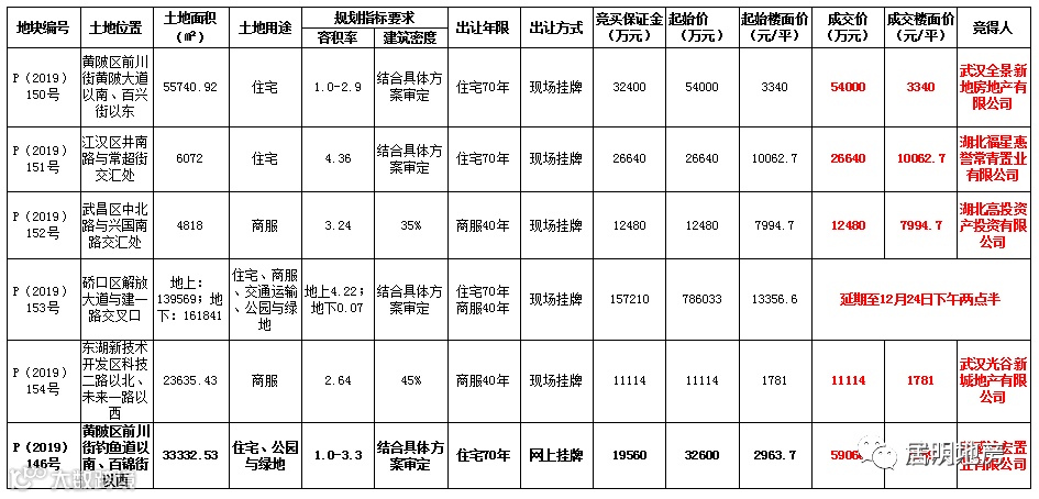 P(2019)150号:由武汉全景新房地产有限公司以底价54000万元竞得,成交楼面价3340元/平。