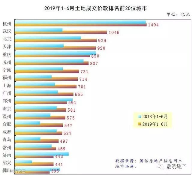 国家信息中心信息化和产业发展部称,今年上半年,杭州以1494亿元的成交价款蝉联城市排名第一;武汉异军突起,由上年同期的第9名前进7名,占据榜眼的位置;北京则由上年同期的第4名前进1名,排名第3。