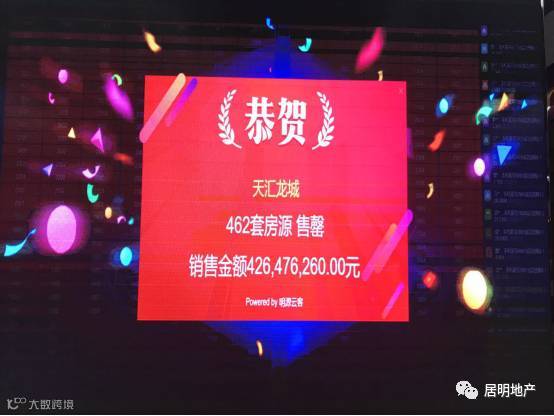 2017年8月27日20:00,由武汉居明房地产顾问有限公司独家代理的天汇龙城龙湖苑一期3#、5#楼在众人翘首企盼之中盛大开盘。此次开盘是天汇龙城项目首次采用网上选房,仅耗时15秒,462套房源随即售磬,成交4.265亿元!