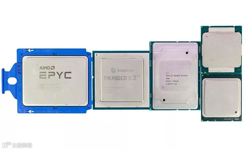 从左至右顺序为:AMD EPYC、Cavium ThunderX2、Intel Xeon