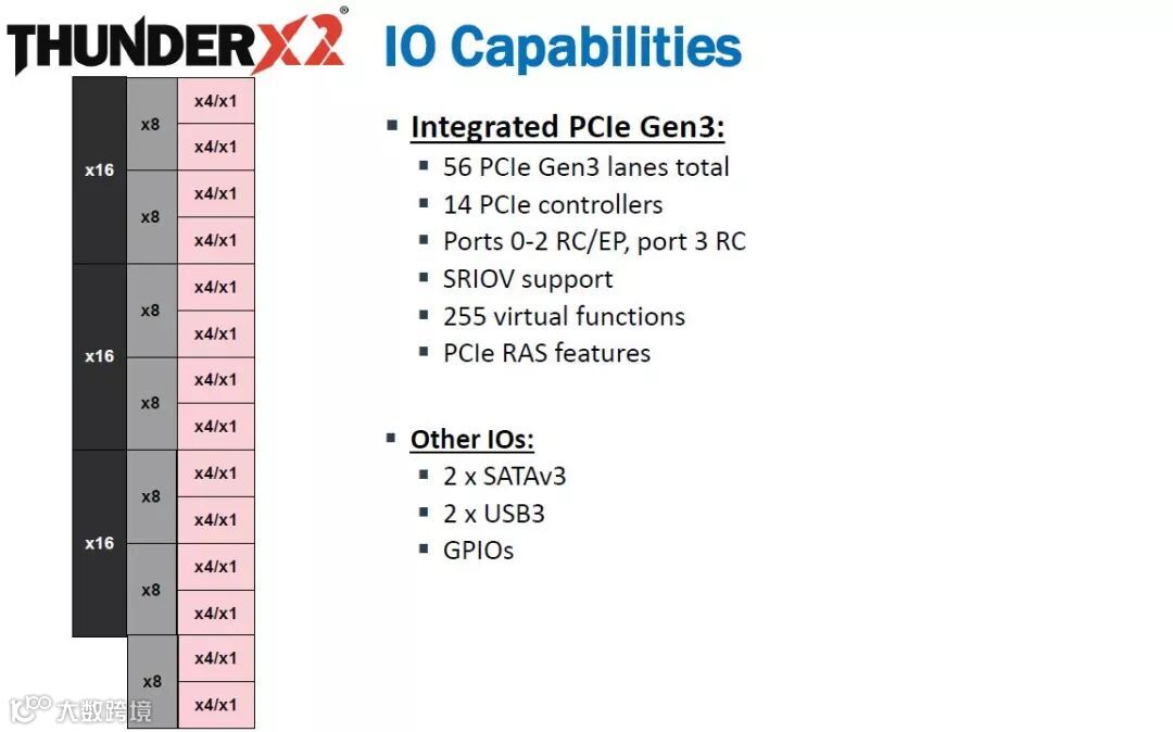在PCIe支持方面,ThunderX2可以支持PCIe 3.0x16总共56个PCIe 3.0通道。同时可将PCIe通道分为x1通道;共有14个PCIe控制器可供系统厂商使用。ThunderX2还支持SR-IOV等其它特性,以确保不落后于x86生态系统。