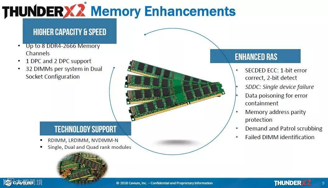 ThunderX2内存带宽非常出色,其最多支持8个DDR4-2666内存控制器,与AMD EPYC相当,较Intel Xeon Scalable更胜一筹。这些内存通道可以支持RAS特性和NVDIMM。
