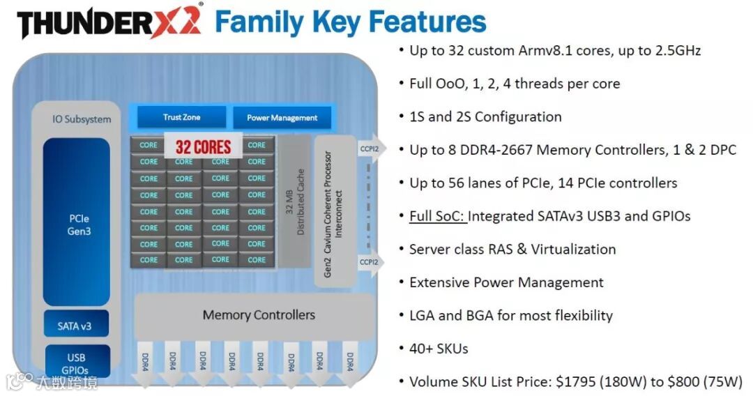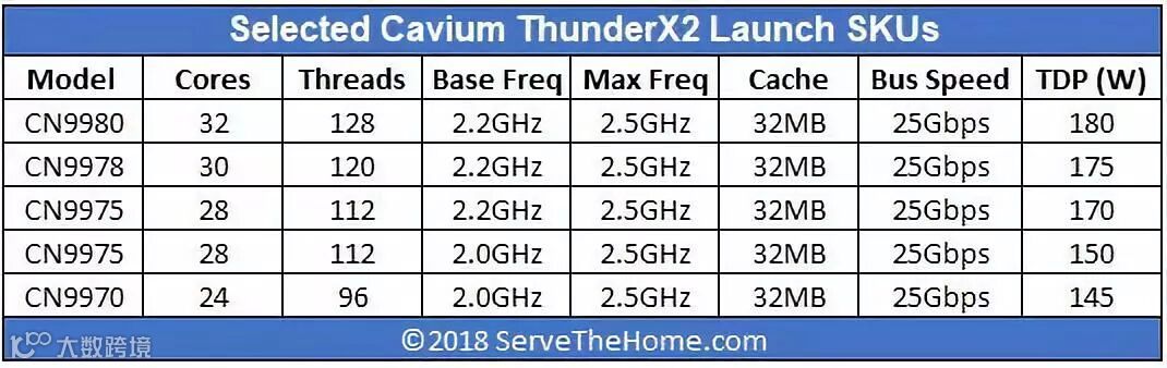 从实际发布的SKU方面看,Cavium推出了大约40种SKU,包括16核到32核以及24到32核、96到128线程等5种SKU的技术规格。每芯片缓存大小为32MB。