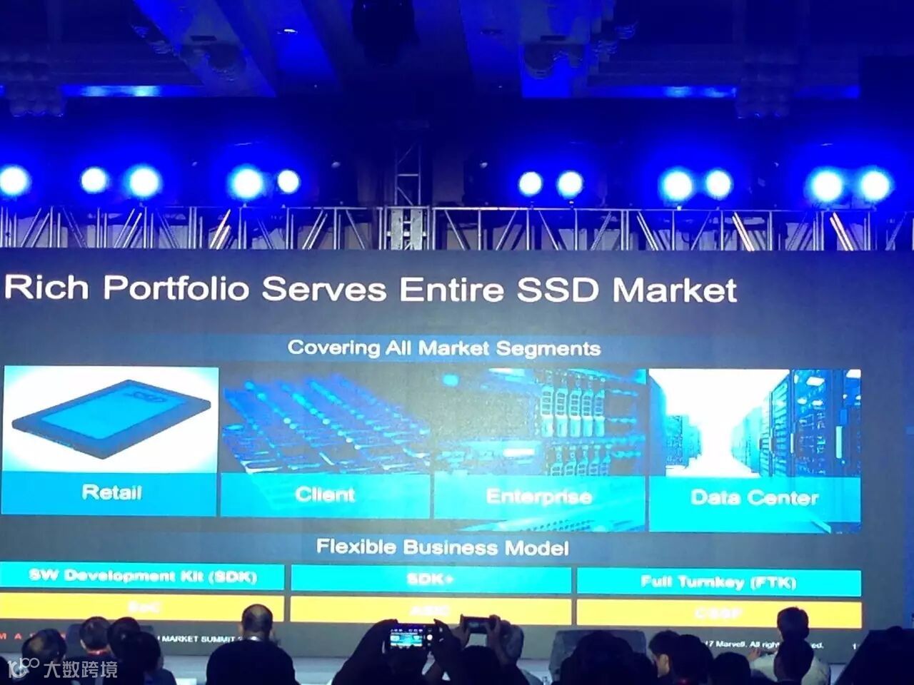 紧接着Michael向现场嘉宾展示了Marvell如何保持市场的领先地位。首先,强大的科研投入使Marvell的存储产品覆盖了所有的细分市场,包括零售、消费类、企业级和数据中心。其次,Marvell拥有灵活的商业模式,如标准器件SoC、给客户做定制化的ASIC以及全交钥匙方案CSSP。