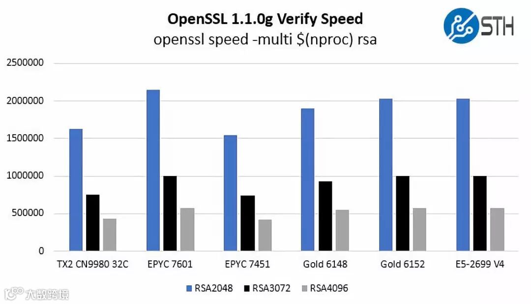 STH(Servethehome.com) 使用OpenSSL1.1.0g(即Ubuntu18.04 LTS最早版本的标配产品)来测试RSA2048、RSA3072和RSA4096。